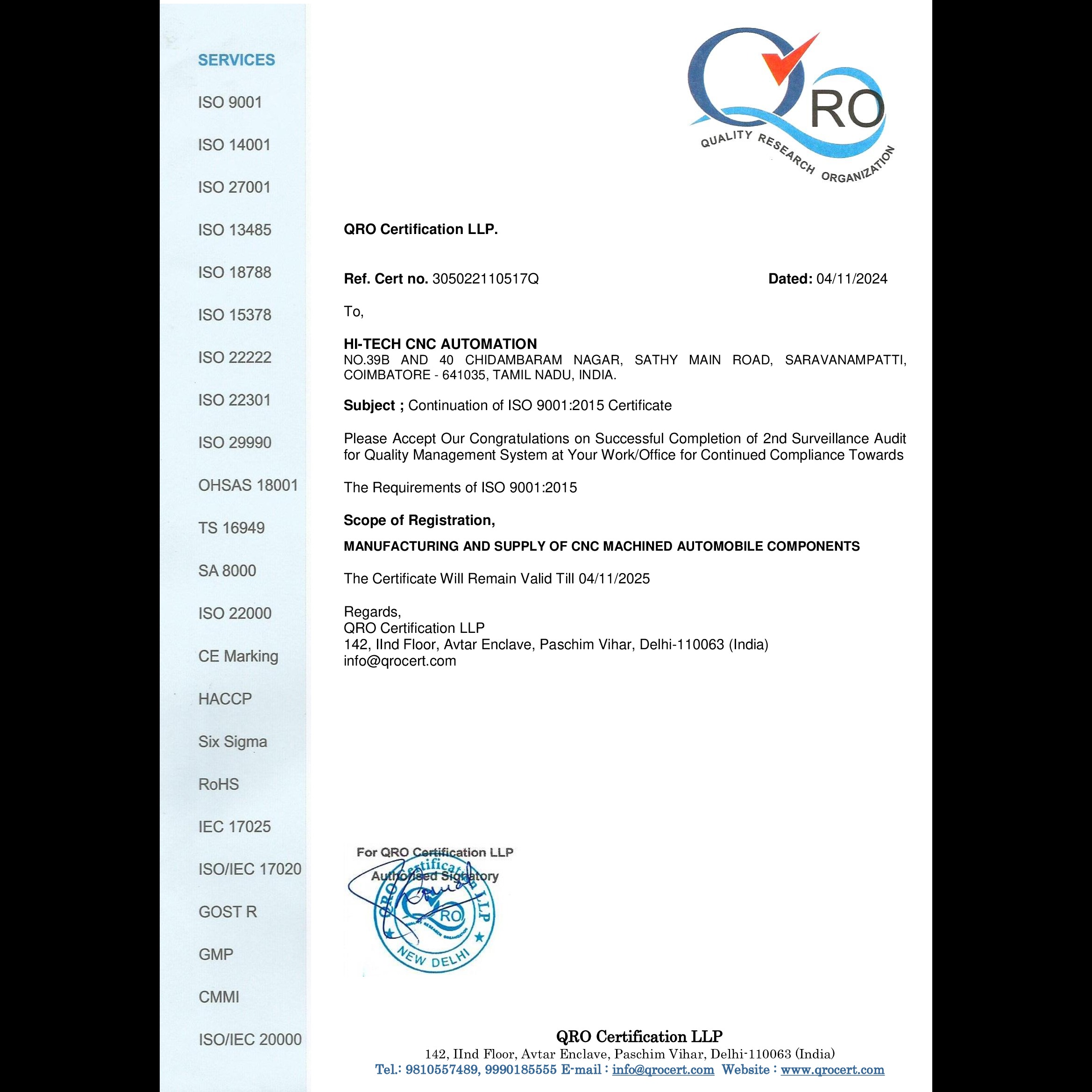 We are pleased to inform that HI-TECH CNC AUTOMATION is an ISO 9001:2015 certified organization. This certification demonstrates our commitment to maintaining a robust Quality Management System (QMS) that ensures consistent quality in the manufacturing of CNC machined components. By adhering to internationally recognized standards, we strive to enhance customer satisfaction, improve operational efficiency, and ensure continual improvement across all levels of our organization. Our ISO certification reinforces the trust and confidence our customers place in our products and services.